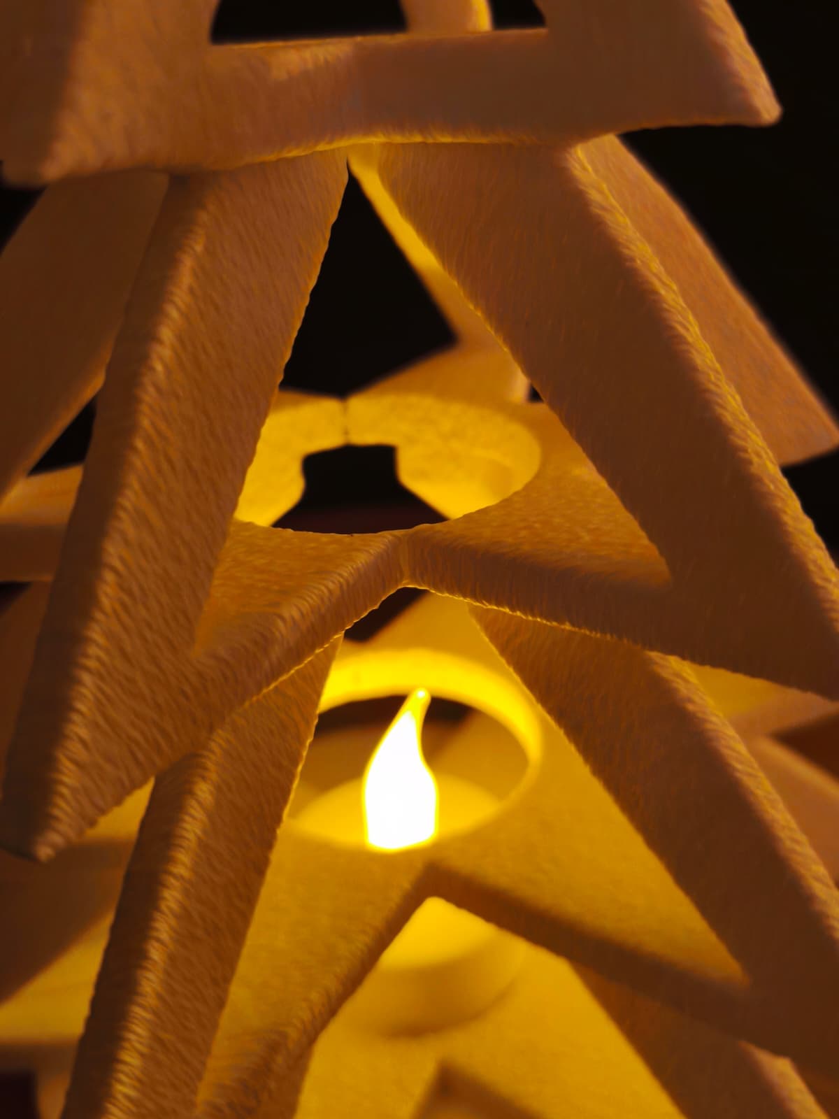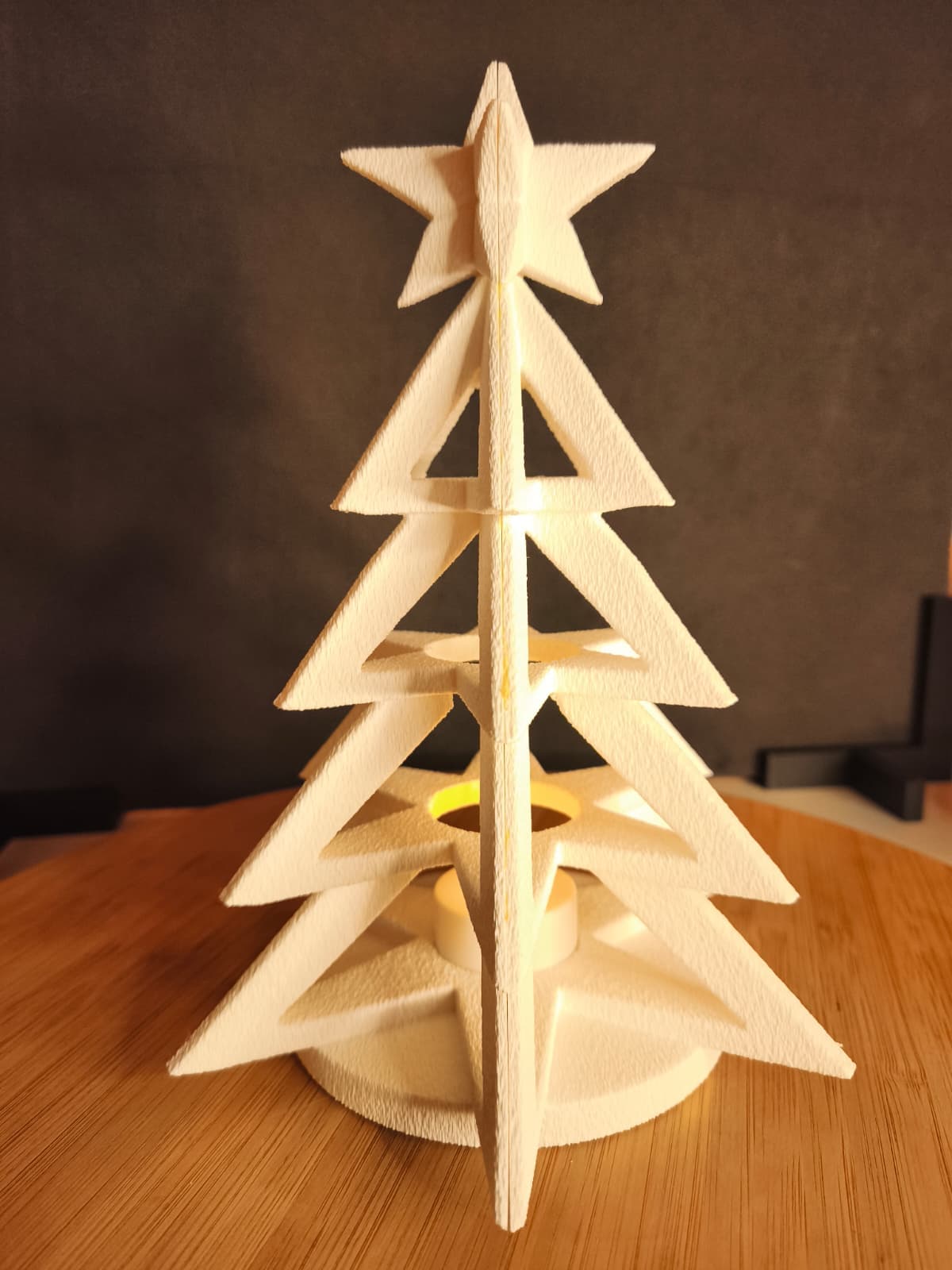 • Modular structure: Stackable triangular tiers form a conical tree with a central cavity for a tealight.