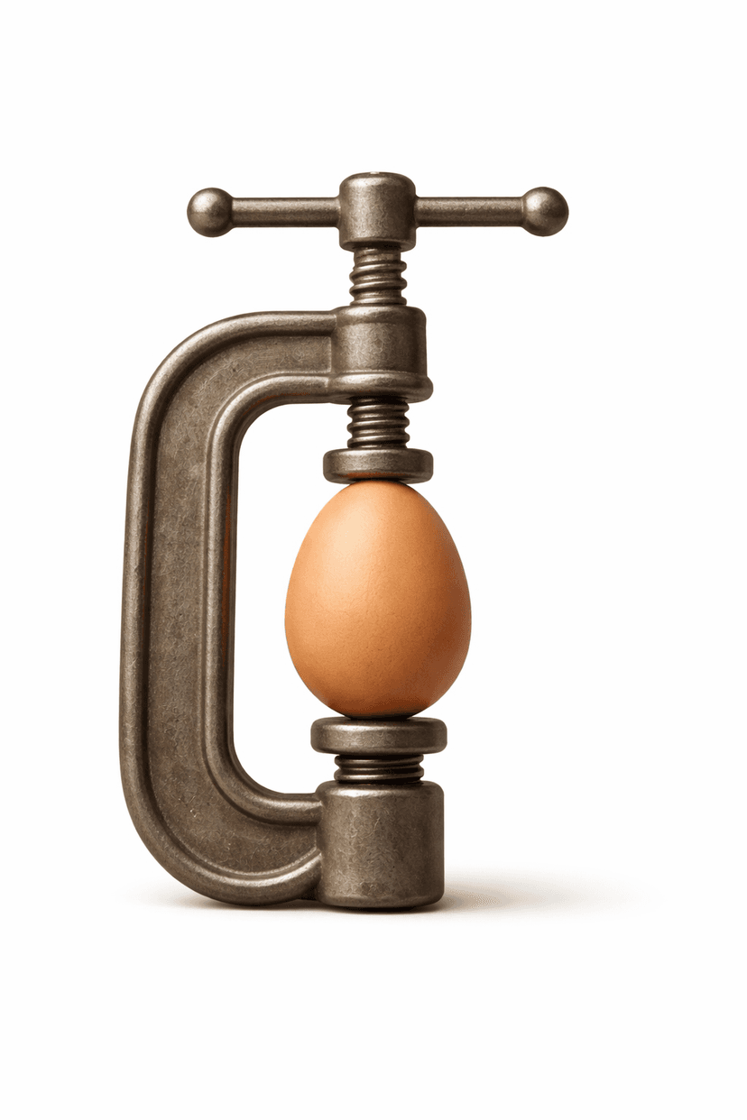A stylized, old-school woodshop clamp gently holding an egg at its center, symbolizing grace under pressure.